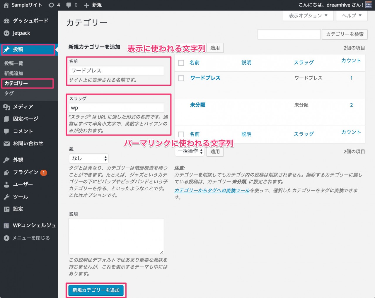 - 「名前」に表示する文字列を、「スラッグ」にパーマリンクで使う文字列を指定する